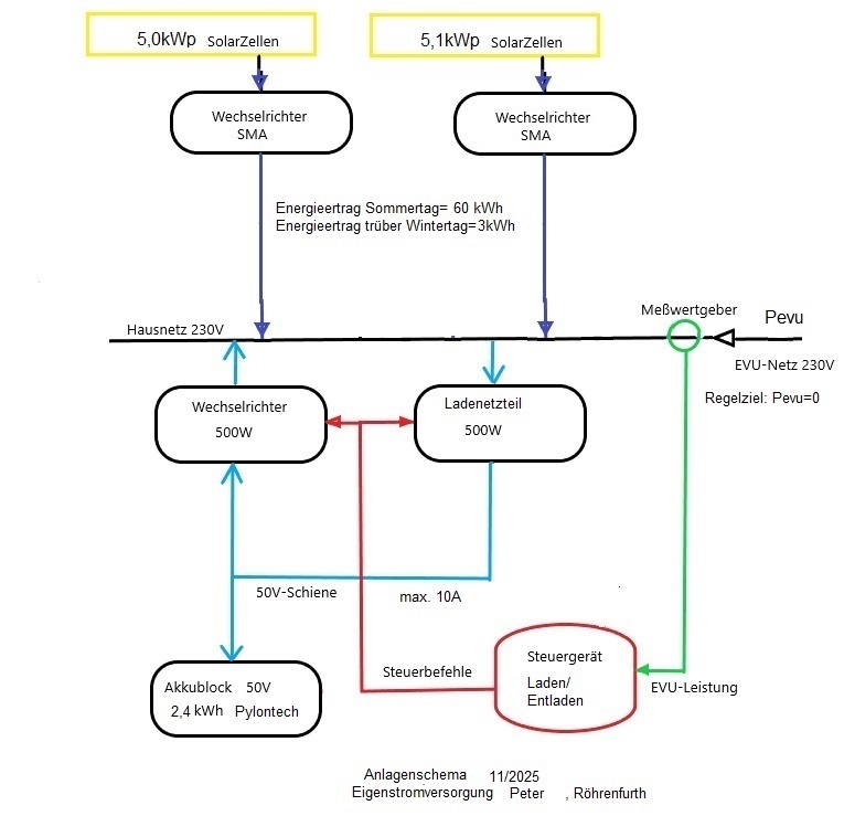 von oben: Schaltkasten mit Laderegler, darunter Wechselrichter und Ladenetzteil,
